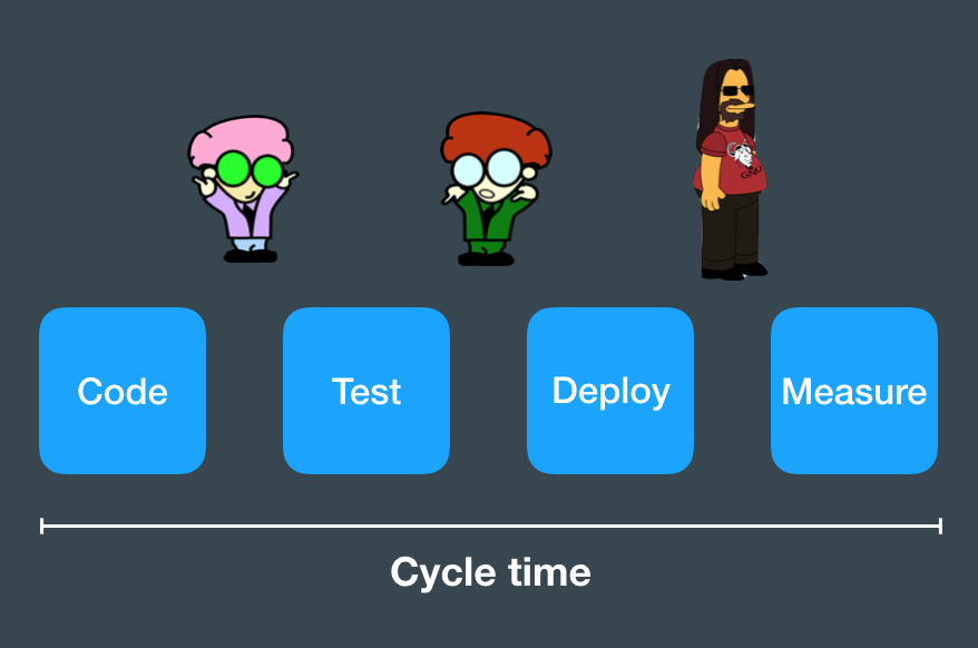 Automation in combination with Cloud Computing soon led to the point where development teams could manage their whole solution, from coding to automated deployment to production and operations. In a startup setting you would typically have one team that took care of the whole product that the company was offering. By measuring what happens in the product the team can make experiments on what they can improve to better fit the markets need.